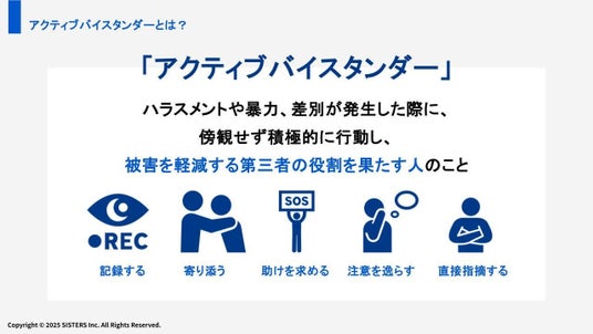 株式会社SISTERS(所在地:東京都新宿区、代表取締役社長: 鈴木彩衣音)は、職場におけるハラスメント防止と対応力向上を目的に、アクティブバイスタンダー研修の提供を行っています。このたび当社では、見て見ぬふりを防ぐ行動を促す一歩として、実際の研修で使用している資料の一部を無料で公開いたしました。これに合わせて、7月30日(水)に特別イベント「注目の“見て見ぬふりをやめる研修”を体感する|人事・組織開発コンプラ担当者のためのアクティブバイスタンダー体験会」も開催いたします。
