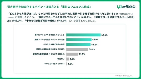 引き継ぎをより時間をかけず効率的に行う方法として、最も多く挙げられたのが「事前にマニュアルを作成しておくこと」(引き継ぐ人54.7%、引き継がれる人62.6%)。さらに、「業務フローを
