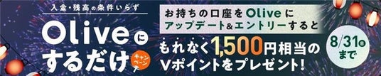 お持ちの口座をOliveにアップデート&エントリーいただいたお客さまに、もれなく1,500円分のVポイントをプレゼントするキャンペーンです。複雑な入金・残高条件は一切ございません!