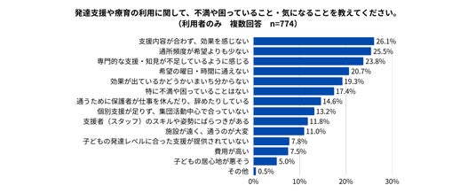 ▪︎発達支援・療育利用者の最大の不満は「支援内容が合わず、効果を感じない」で26.1%、8割以上が何らかの課題を抱えている