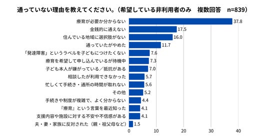 この「希望しているが通えていない」839名の中で最も多かった理由は、「療育が必要か分からない」で37.8%。専門的な支援の必要性を保護者が適切に判断できる情報提供体制の整備が重要な課題であることが明らかになりました。次いで「金銭的に通えない」が17.5%、「住んでいる地域に選択肢がない」が16.0%となり、経済的負担や地域格差の問題が深刻であることも明白になりました。また、「療育を希望して申し込んでいるが待機中」が7.3%となっており、施設不足による待機問題も顕在化しています。