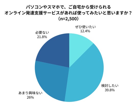 保護者の50%超がオンライン発達支援サービスに関心を示しており、従来の対面・通所型療育の課題解決策として期待が高まっています。約半数の保護者が支援を受けないことによる困りごとを抱え、「子どもの将来が漠然と不安」(22.8%)という声も多く、地域格差や待機問題、時間制約などの解決手段として、新たな支援形態への関心が高いことが判明しました。