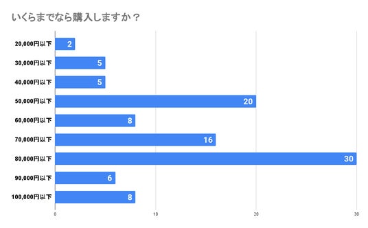 調査の結果、回答にはばらつきがあるものの「80,000円以下であれば購入したい」という意見が多いことが分かりました。