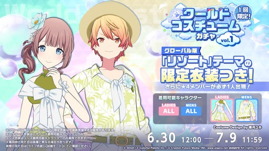 6月30日(月)の12時より、ワールドコスチュームガチャの開催が決定いたしました。本ガチャでは、★4メンバーが必ず1人出現するほか、グローバル版「プロジェクトセカイ」からリリースされた「リゾート」テーマの限定衣装が付属するガチャと、「イースター」テーマの限定衣装が付属するガチャの計2種類を実施いたします。いずれもおひとり様一回限りで、有償クリスタル3,000個で引くことができます。