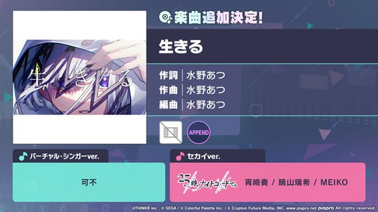 新たなリズムゲーム楽曲として、海外版(グローバル版、繁体字版、韓国版)「プロジェクトセカイ」で先行実装された以下5曲を、6月30日(月)より5日間連続で追加することが決定いたしました。