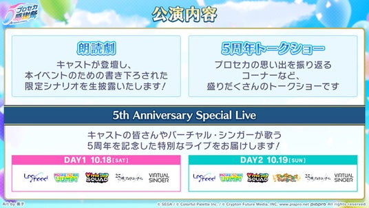 本イベントは、10月18日(土)・19日(日)の2日間にわたり、東京ガーデンシアターにて開催いたします。18日(土)には14名、19日(日)には17名のキャストが出演し、朗読劇や5周年トークショー、「5th Anniversary Special Live」をお届けいたします。