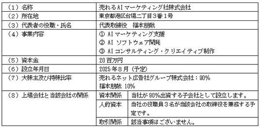 当社は、2025年6月28日開催の取締役会において、当社の子会社としてAIマーケティング支援事業に関するサービス提供を行う「売れるAIマーケティング社株式会社」を設立し、新たな事業を開始することについて決議いたしましたので、以下のとおりお知らせいたします。