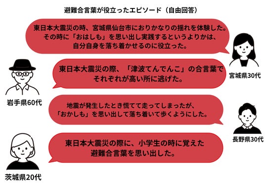 避難合言葉が役立った経験を聞いたところ、「東日本大震災の際、津波てんでんこの合言葉でそれぞれが高い所に逃げた。」「大人になり教師として実際に地震を経験したとき、生徒と避難合言葉を確認することで全員落ち着いて避難できた。」など、実際の非常時での活用例も寄せられました。