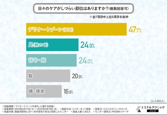 「日々のケアがしづらい部位はありますか?(複数回答可)」と質問したところ、『デリケートゾーン(VIO)(47.7%)』と回答した方が最も多く、『足(靴の中)(24.9%)』『背中・胸(24.0%)』となりました。