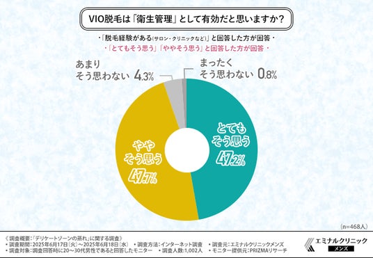 最後に、「VIO脱毛は「衛生管理」として有効だと思いますか?」と質問したところ、約9割が『とてもそう思う(47.2%)』『ややそう思う(47.7%)』と回答しました。
