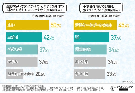 湿気が多い季節に感じる不快感は「ムレ」。不快感を感じる部位1位は「デリケートゾーン」!