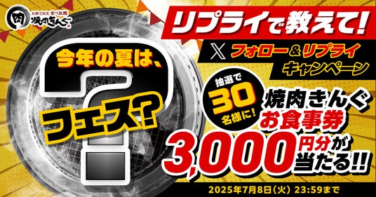 株式会社物語コーポレーション(本社:愛知県豊橋市/代表取締役社長:加藤 央之)が全国で351店舗を展開する『焼肉きんぐ』は、夏の期間限定メニュー販売に先駆けて、「今年の夏は○フェス!フォロー&リプライキャンペーン」を開催いたします。