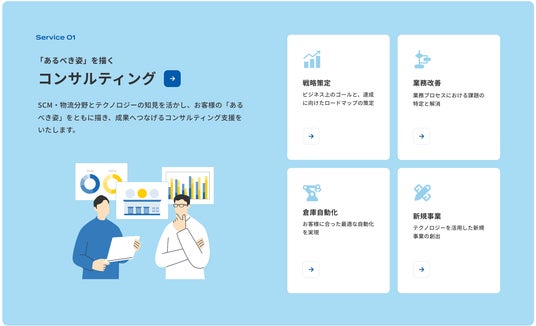 コンサルティングでは、お客さまの『あるべき姿』をともに描き、成果へと繋げるための伴走支援を提供します。ビジネスの指針となる戦略策定、現場における業務改善、最新テクノロジーを活用した倉庫自動化、新たな価値創造を目指す新規事業創出など、事業のフェーズやテーマを問わず、お客さまの状況に深く寄り添いながら最適な解決アプローチを設計・実行します。