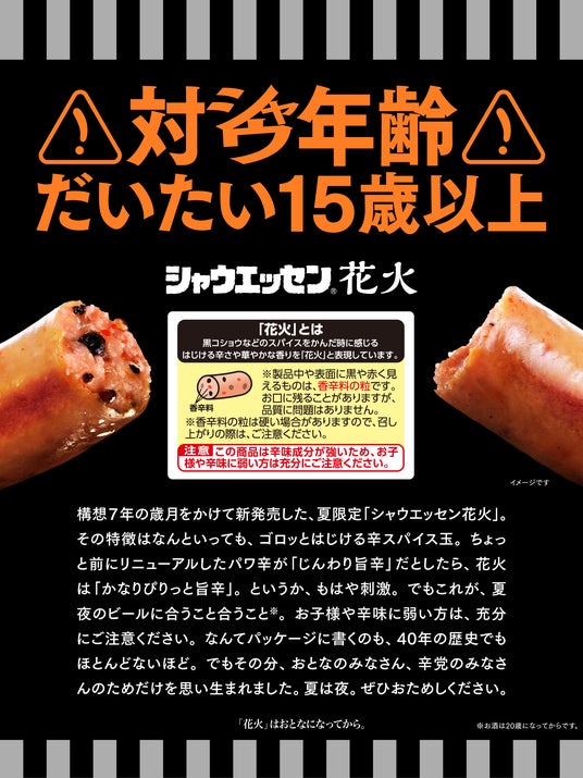 7月1日(火)から新発売!夏限定「シャウエッセン(R) 花火」、「対シャウ年齢だいたい15歳以上」 刺激的な辛さの“辛スパイス玉”とは!? 発売を記念して7月26日(土)に都内でドローンショーを開催