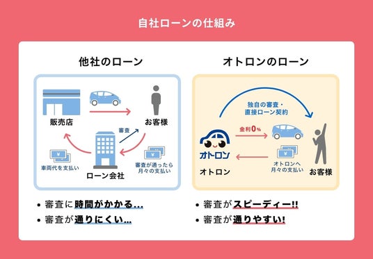 オトロンの「自社ローン」では、信販会社を介さず、当社とお客様との直接契約により分割払い手続きを行います。この仕組みにより、多くのお客様にご利用いただきやすい環境を整えることで、高い審査通過率を実現しております。