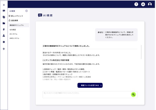 メイン機能であるAI検索は、自然言語での検索に対応しています。ユーザーが質問形式で入力しても、AIが最適な回答を導き出し、その根拠となるファイルへのリンクを提示します。これにより、必要な情報へ素早くアクセスし、業務効率を大幅に向上させられます。