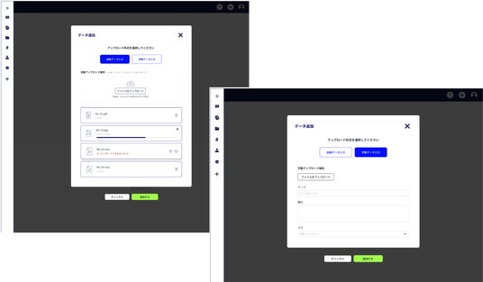 データの元となるファイルを簡単に登録できます。自動インポートと手動アップロードの両方に対応しており、大量のファイルを効率的に取り込むことが可能です。手動アップロード時には、関連するタグを複数選択して付与することもできます。