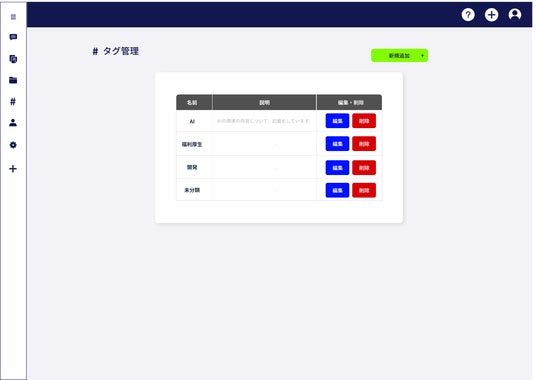 データに紐づくタグを一元的に管理できます。タグの新規作成、変更、削除が可能で、既存データへのタグの紐付けも柔軟に行えます。これにより、情報の分類と検索の精度を向上させます。