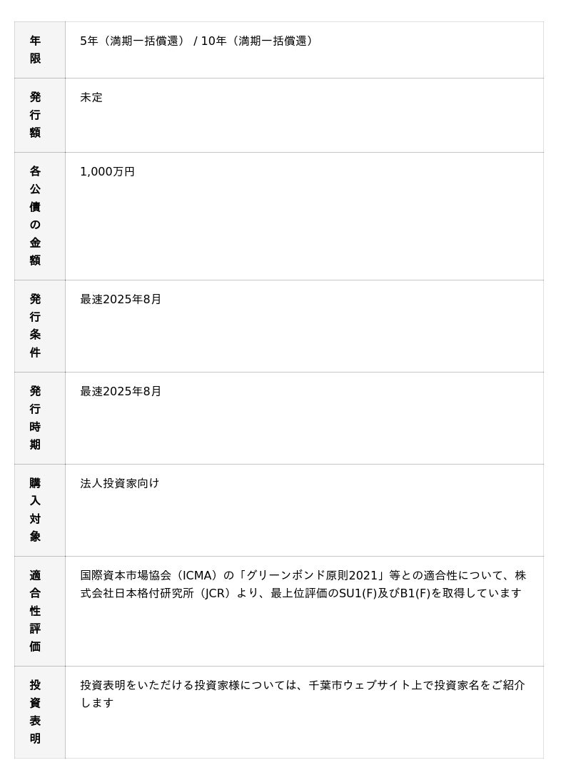 大和証券株式会社(本社:東京都千代田区、代表取締役社長 荻野明彦、以下、「大和証券」)は、千葉市(神谷俊一市長)が2025年8月に発行を予定するグリーンボンド(以下、「本債券」)を、千葉県内13か所の支店・営業所をはじめ、全国の大和証券窓口でご購入いただけることをお知らせいたします。
