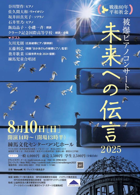 有限会社ヴォイスケ(代表:飯島晶子)主催、被爆ピアノコンサート『未来への伝言2025』が2025年8月10日 (日)に練馬文化センター 小ホール(つつじホール)(東京都練馬区練馬1-17-37)にて開催されます。