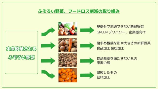 「GREENデリバリー」を運営する株式会社まるごとは、フードロス削減を目指し、食べられる野菜は皆様へお届けし、傷ついた野菜は加工食品に、そして食べられない部分は家畜の飼料や農家の肥料として再利用することで、資源を無駄なく活用する取り組みを目指しています。