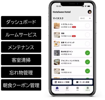 「Hotelwee」は、すべての業務を一つのプラットフォームで可視化し、タスクの遅延や抜け漏れを防止します。 さらに、AIによる最適な業務配分によりスタッフの負担を軽減します。宿泊者はスマートフォンからサービスを簡単に依頼でき、業務効率化と顧客満足度向上を同時に実現します。
