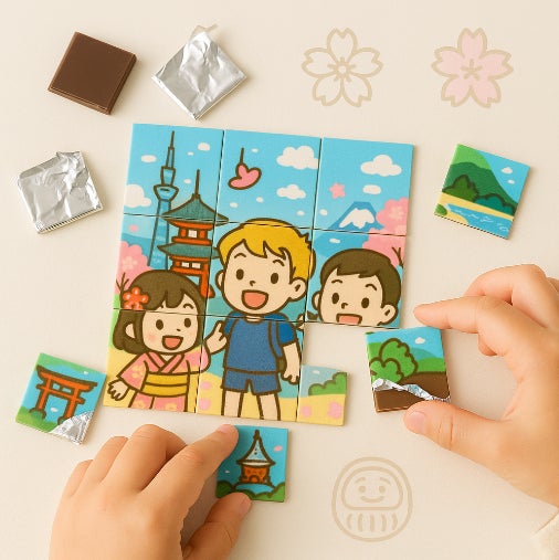 子どもたちに大人気の“遊べるチョコ”が登場!カラフルなイラストをパズルのように並べて遊んだあとは、そのままおやつタイムに♪お部屋での時間がちょっと特別になる、嬉しいチョコレートです。