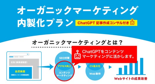 SEO対策やコンテンツマーケティングを強化することで、検索エンジン経由でのアクセスアップから成約に結び付ける「オーガニックマーケティング」。ChatGPTを活用した記事作成コンサルティングを提供しています。