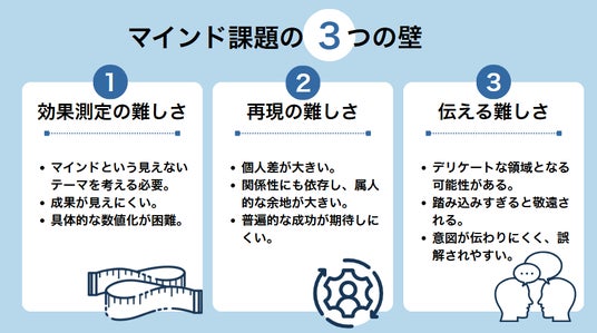 しかしながら、この2軸のアプローチのうち、多くの組織ではどうしても“仕組み”の構築を優先し、“マインドの変革”については(1)効果測定の難しさ、(2)再現の難しさ、(3)伝える難しさの3つの壁に阻まれ、後回しにされてしまう事が現実です。