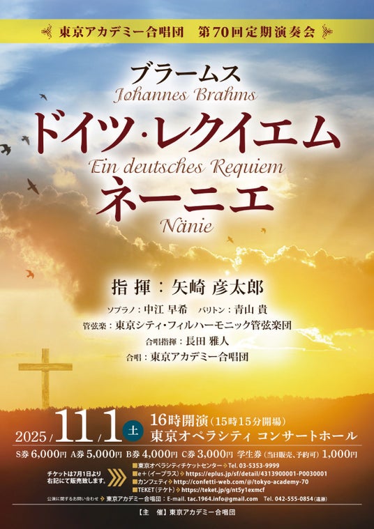 東京アカデミー合唱団『第70回定期演奏会』が2025年11月1日 (土)に東京オペラシティ コンサートホール(東京都 新宿区 西新宿 3-20-2 西新宿東京オペラシティ3階)にて開催されます。