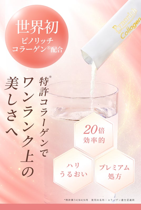 ・世界初*¹「ピノリッチコラーゲン」配合: 特許取得済みの独自素材「ピノリッチコラーゲン」(特許第7428426号 発明の名称:コラーゲン産生促進剤)は、体内コラーゲン分解時に生じる「ピリジノリン」に着目しています。一般的なコラーゲンと比較してピリジノリン含量が4倍以上、フィッシュコラーゲンと比較して20倍以上と、コラーゲン産生に働きかける「スイッチ成分」が豊富に含まれています 。
