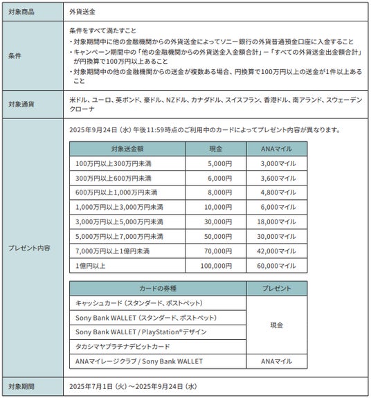 ソニー銀行への外貨送金で現金またはANAマイルプレゼント キャンペーン実施のお知らせ