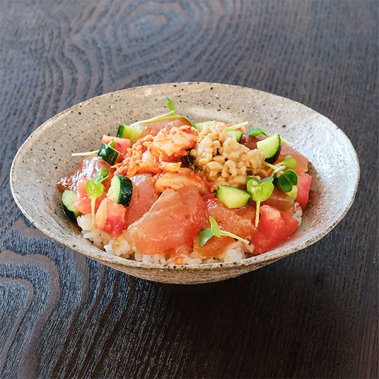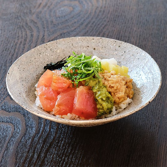 天然もち鮪にキムチと納豆、夏野菜、ごま油を合わせました。ピリ辛風味と発酵食品の旨みが融合した、ごはんが進む一杯です。暑い時期にも食欲をそそる組み合わせです。