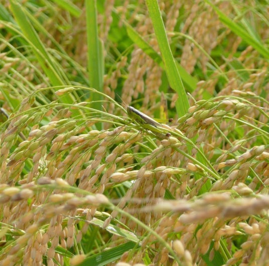 古代米浦部農園の稲穂。中央にはバッタ
