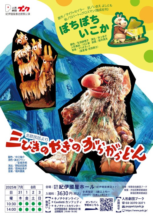 人形劇団プーク主催、紀伊國屋ホール 夏休み公演『三びきのやぎのがらがらどん/ぼちぼちいこか』が2025年7月31日 (木) ~ 2025年8月3日 (日)に紀伊國屋ホール(東京都新宿区新宿3-17-7)にて上演されます。