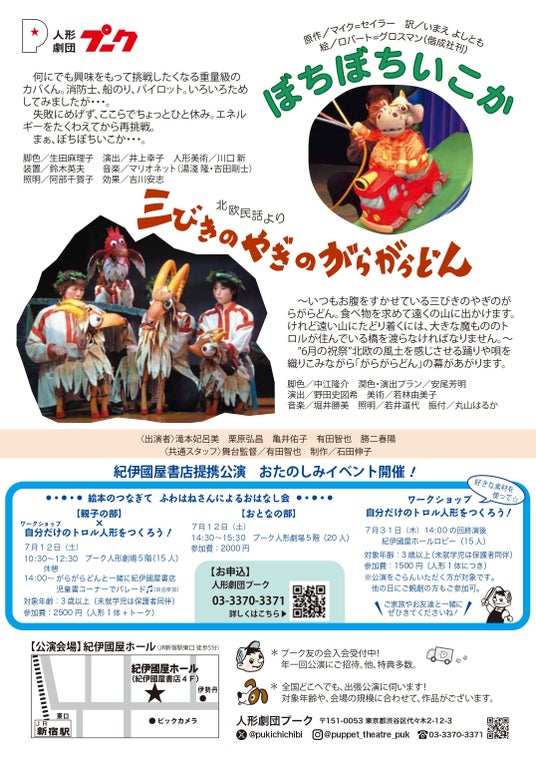 人形劇団プーク 人気作品二本立て『三びきのやぎのがらがらどん/ぼちぼちいこか』& 絵本講師 ふわはねさんおはなし会開催決定!