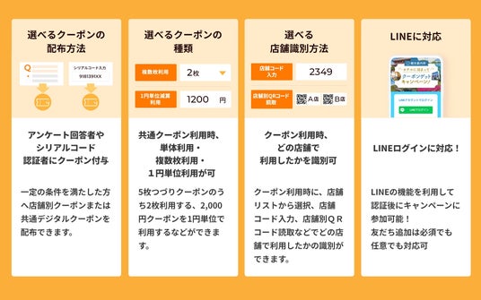 店舗ごとのクーポンや、1回限りで利用できるクーポンに対応しており、今後は、複数枚つづり形式や1円単位で利用できる形式(いずれも後日リリース予定)も順次追加する予定です。これにより、さまざまな利用シーンや施策の目的に応じて最適なクーポン設定が可能となり、より効果的なプロモーション展開が実現できます。