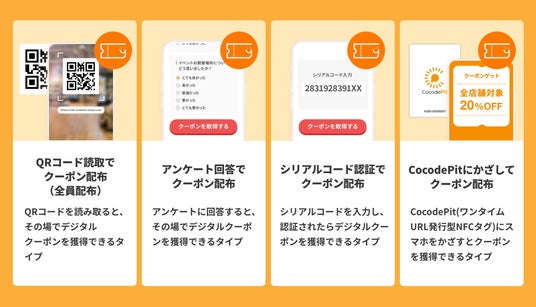 専用NFCタグ「CocodePit」にスマートフォンをかざすだけで、参加者が簡単にクーポンを取得できる配布形式です。特定の場所に設置することで、その場所を訪れた人のみがクーポンを取得できるため、実際にサービスや店舗を利用する可能性のあるターゲット層に適切にクーポンを配布できます。