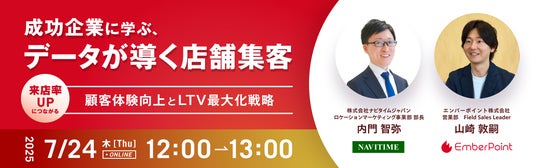 セミカスタム型モバイルアプリパッケージ「App Publisher」を提供するエンバーポイント株式会社(本社:東京都千代田区、代表取締役:五十嵐 真人、以下エンバーポイント)は、2025年7月24日(木)12時00分より、株式会社ナビタイムジャパンのロケーションマーケティング事業部と無料ウェビナー『成功企業に学ぶ、データが導く店舗集客~来店率UPにつながる顧客体験向上とLTV最大化戦略~』を開催いたしますのでお知らせいたします。