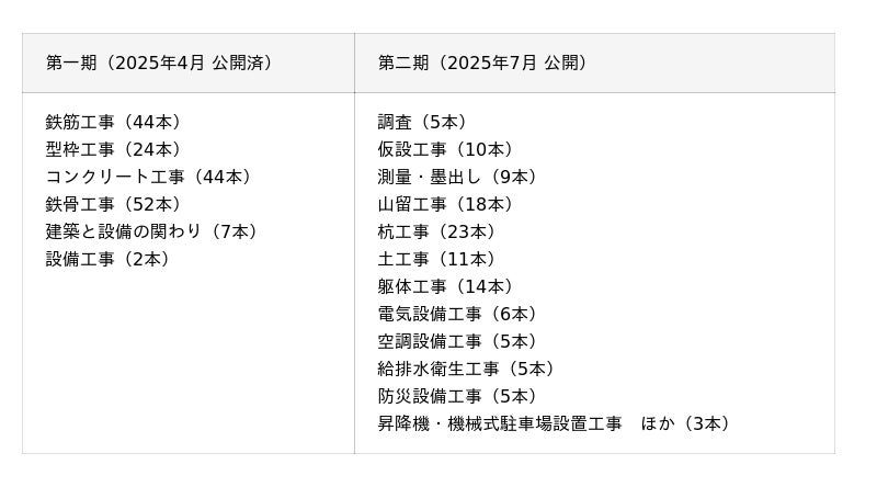 今回の第二期では、第一期(2025年4月公開:躯体工事・一部設備工事/全173本)に続き、以下の工種・工程を対象に新たに114本の教育動画を追加。建設現場で求められる実務知識を、より体系的かつ短時間で習得可能な内容へと拡充しています。