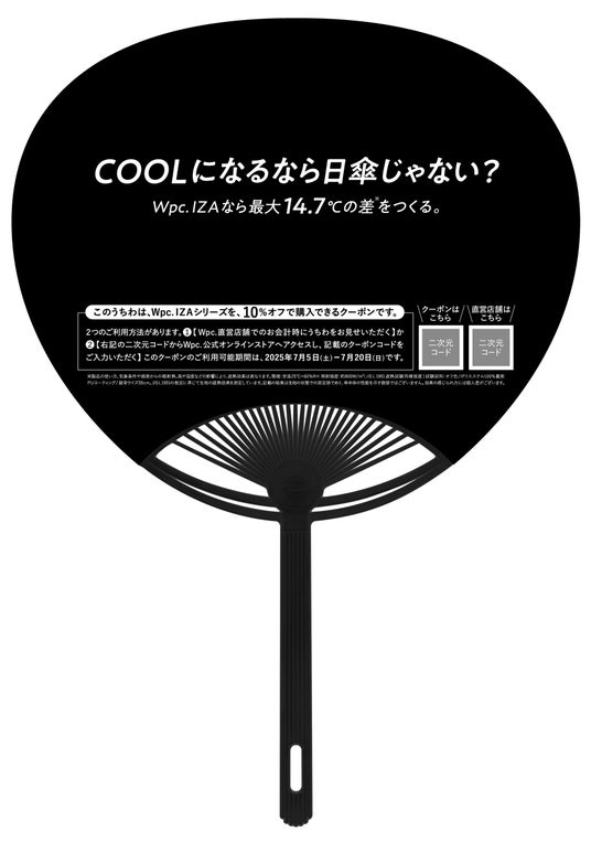 2025年7月5日(土)・6日(日)の2日間限定で、Wpc. IZAオリジナルTシャツを着用したスタッフが、限定うちわを配布します。うちわには、Wpc.直営店舗またはWpc.公式オンラインストアで使える10%OFFクーポンに加え、“暑さ対策としての日傘”の重要性を伝えるメッセージも添えられています。ひとときの涼しさとともに、日傘という新しい選択肢に出会えるきっかけになることを期待しています。
