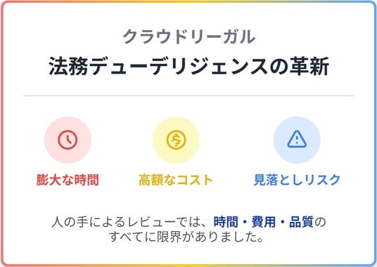 クラウドリーガルは、日本社会における様々な企業の経営安定化や事業継続、そして国際社会における競争力強化などに必要なM&A・事業譲渡等での法務デューデリジェンス(法務DD)対応の迅速化を支援していきます。