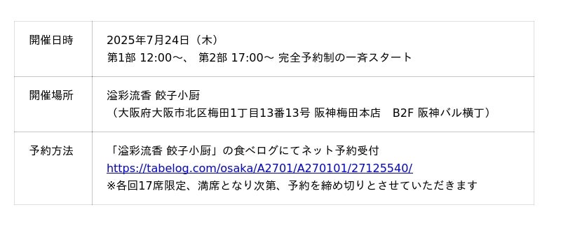 飲食店の経営および飲食店の業態企画開発を行うアイ・エム・オー株式会社(本社:東京都渋谷区、代表取締役社長丸山朗)は、かつて’1日で1年間の予約が埋まってしまう’として知られた中国家庭料理の名店「溢彩流香」のオーナー・叶 朝陽(イエ・チャオヤン)氏によるおまかせコースを提供する「リンさんDAY」を7月24日(木)に阪神梅田本店の「溢彩流香 餃子小厨」にて開催いたします。