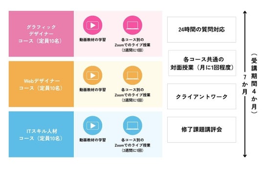 当事業は、1.グラフィックデザイナーコース2.Webデザイナーコース3.ITスキル人材育成コースを開講し、各コースに合わせてさまざまなデジタルスキルを習得できます。また、コミュニケーションスキル育成や就職活動・フリーランス対策を行う対面授業も盛岡にて実施します。これらのプログラムを通して、Webデザイナーやマーケター、IT人材として活躍するための基礎知識やスキルを身に付け、県内企業への就職や転職、副業、フリーランスなど、希望に合った就労を目指します。