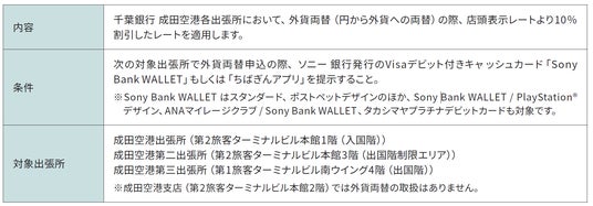 ソニー銀行株式会社(代表取締役社長:南 啓二/本社:東京都千代田区/以下 ソニー銀行)は、株式会社千葉銀行(取締役頭取:米本 努/本社:千葉県千葉市/以下 千葉銀行)の成田空港各出張所における外貨両替優遇を2025年7月1日(火)より開始しますので、お知らせします。