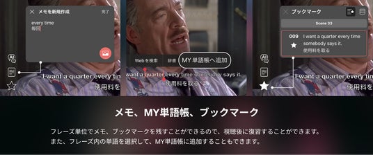 本プランでは、英語音声や日英同時字幕の視聴に加え、1フレーズ単位での巻き戻し・早送り、AIによる語注解説、メモ・ブックマーク機能など、abceedならではの多機能な学習サポートが充実しています。スキマ時間でも効率的に学習を進められる仕様となっています。