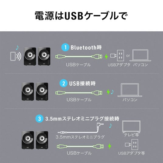 Bluetooth・USB・3.5mmステレオミニプラグの3通りの接続方法に対応。PCだけでなく、スマートフォンやテレビなど様々な機器で接続・音楽を楽しむことが出来ます。また電源はUSB給電式になっており、PC本体やACアダプタなどから給電することができます。