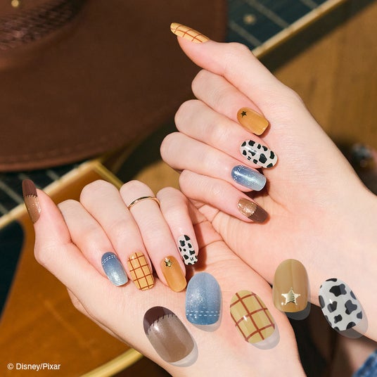 「ウッディ」の衣装にインスピレーションを受け、カウボーイハットをイメージしたブラウンマグネットフレンチ、デニムをイメージしたダブルステッチが特徴のブルーマグネット、ベストをイメージしたホルスタインパターン、シャツをイメージしたチェックなど、コスチューム要素をたっぷり詰め込みました。ゴールド箔の保安官バッジモチーフがアクセントに。ポップでユニークなデザインです。