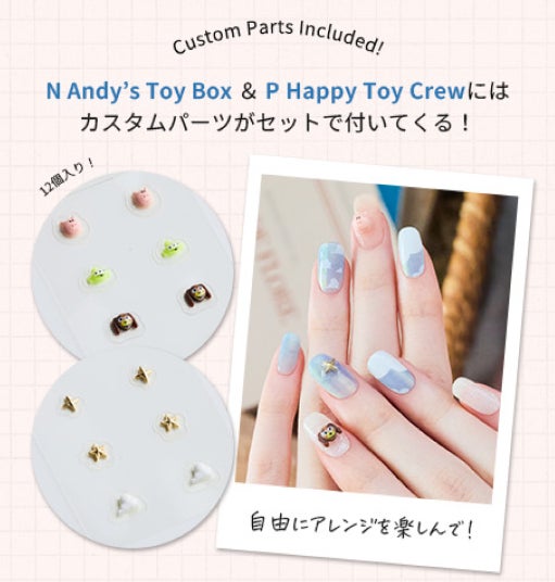 カスタムパーツシール N Andy's Toy BoxとP Happy Toy Crewは、セットで付いてくるカスタムパーツシールをネイルの上から好きな場所に貼ってランプでかためるだけで、自由にアレンジを楽しむことができます。