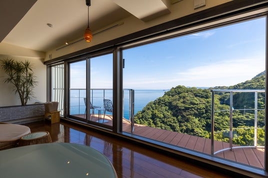 世界ジオパークに認定された伊豆半島の稜線を望む高台に佇む、全室温泉付きの天空のプライベートホテル。伊豆大島や初島までを見渡す絶景の中でふたりだけの時間を大切にしたい大人たちへ--。